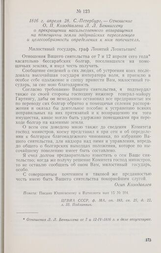 1816 г. апреля 28. С.-Петербург. — Отношение О. П. Козодавлева Л. Л. Беннигсену о прекращении насильственного возвращения на помещичьи земли задунайских переселенцев и целесообразности определения к ним попечителя // ЦГВИА СССР, ф. МА, оп. 183, св. 25, д. 22, л. 33. Подлинник.