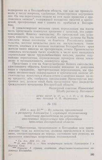 1816 г. мая 21. — Из записки, приложенной к рескрипту Александра I, служащей полномочному наместнику руководством по устройству иностранных переселенцев при образовании правления Бессарабской области // ЦГИАЛ, ф. 1263, оп. 7, д. 95, лл. 742—747. Копия. Опубликован А. Клаусом, Наши колонии, вып. 1, С.-Пб., 1869, стр. 84—94.