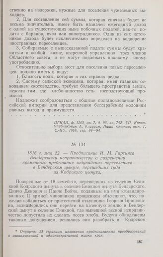 1816 г. мая 22, — Предписание И. М. Гартинга Бендерскому исправничеству о разрешении временного пребывания задунайских переселенцев в Бендерском цынуте, перешедших туда из Кодрского цынута // ЦГИА МССР, ф. 5, оп. 2, д. 143, л. 558. Копия.