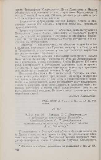 1816 г. мая 30. — Записка С. С. Джунковского о задунайских переселенцах Бессарабии, препровожденная О. П. Козодавлевым полномочному наместнику Бессарабской области А. Н. Бахметеву // ЦГИА МССР, ф. 17, оп. 1, д. 17, лл. 1—8. Подлинник.