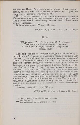 Главная История Молдавии: Док. и материалы. Т. II. Устройство задунайских п... Документы 1816 г. июня 17. — Предписание И. М. Гартинга Томаровскому исправни...