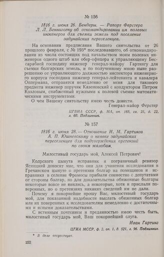 1816 г. июня 28. — Отношение И. М. Гартинга А. П. Юшневскому о неявке задунайских переселенцев для подтверждения претензий по своим жалобам // ЦГИА МССР, ф. 2, оп. 1, д. 521, л. 96. Подлинник.