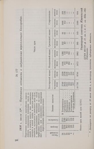 1816 г. июля 13. — Перечневая ведомость о задунайских переселенцах Бессарабии // ЦГИА МССР, ф. 17, оп. 1, д. 17, л. 163а—164. Подлинник.