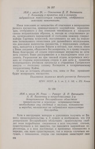 1816 г. июля 26. Рени. — Рапорт Д. П. Ватикиоти А. Н. Бахметеву о непредставлении 2-м департаментом Бессарабского областного правительства и земскими исправничествами необходимых ему сведений о налогах, повинностях и нарядах, налагаемых на задунайских переселенцев Бессарабии // ЦГИА МССР, ф. 17, оп. 1, д. 17, лл. 70—71. Подлинник.