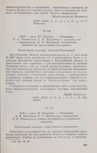 1816 г. июля 26. Тульчин. — Отношение Л. Л. Беннигсена А. Н. Бахметеву о согласии его с назначением Д. П. Ватикиоти попечителем задунайских переселенцев Бессарабии // ЦГИА МССР, ф. 17. оп. 1. д. 17. л. 84. Подлинник.