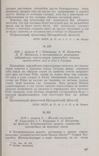 1816 г. августа 8. — Отношение А. Н. Бахметева Д. П. Ватикиоти о невозможности разрешения задунайским переселенцам производить покупку строительного леса и соли в Галацах // ЦГИА МССР, ф. 17, оп. 1, д. 17, л. 94. Отпуск.