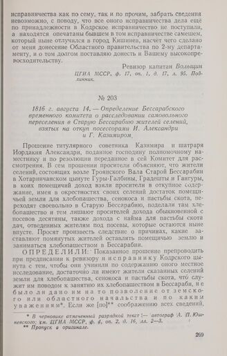 1816 г. августа 14. — Определение Бессарабского временного комитета о расследовании самовольного переселения в Старую Бессарабию жителей селений, взятых на откуп посессорами И. Александри и Г. Казимиром // ЦГИА МССР. ф. 5, оп. 2, д. 236, лл. 42—43. Подлинник.