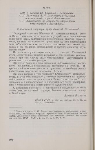 Главная История Молдавии: Док. и материалы. Т. II. Устройство задунайских п... Документы 1816 г. августа 23. Кишинев. — Отношение А. Н. Бахметева Л. Л. Бенн...