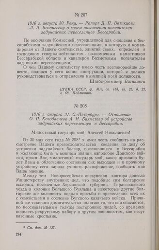 1816 г. августа 30. Рени. — Рапорт Д. П. Ватикиоти Л. Л. Беннигсену о своем назначении попечителем задунайских переселенцев Бессарабии // ЦГВИА СССР, ф. МА, оп. 183, св. 25. д. 22. л. 68. Подлинник.
