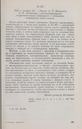 1816 г. октября 18. — Рапорт Д. П. Ватикиоти А. Н. Бахметеву о непрекращающихся злоупотреблениях откупщиков в отношении задунайских переселенцев // ЦГИА МССР, ф. 17, оп. 1, д. 17, л. 138. Подлинник.