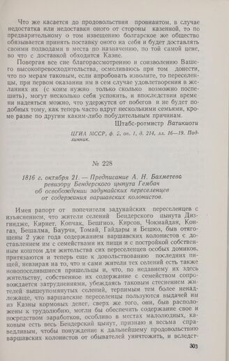 1816 г. октября 21. — Предписание А. Н. Бахметева ревизору Бендерского цынута Гембач об освобождении задунайских переселенцев от содержания варшавских колонистов // ЦГИА МССР, ф. 17, оп. 1, д. 17, лл. 142—143. Отпуск.