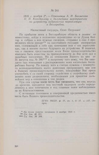 1816 г. ноября 2. — Отношение А. Н. Бахметеѳа О. П. Козодавлеву о дальнейших мероприятиях по устройству задунайских переселенцев в Бессарабии // ЦГИА МССР, ф. 17, оп. 1, д. 17, л. 117. Отпуск.