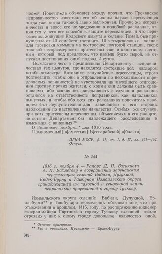 1816 г. ноября 4. — Рапорт Д. П. Ватикиоти А. Н. Бахметеву о возвращении задунайским переселенцам селений Бабили, Дулукиой, Ердек-Бурну и Ташбунар Измаильского округа принадлежащей им пахотной и сенокосной земли, неправильно прирезанной к городу Тучкову // ЦГИА МССР, ф. 2, оп. 1, д. 214, л. 26. Подлинник.