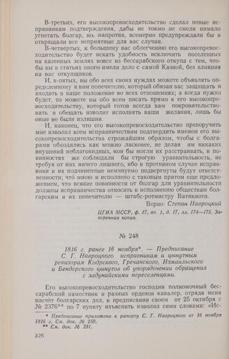 1816 г. ранее 16 ноября. — Предписание С. Г. Навроцкого исправникам и цынутным ревизорам Кодрского, Гречанского, Измаильского и Бендерского цынутов об упорядочении обращения с задунайскими переселенцами // ЦГИА МССР, ф. 17, оп. 1, д. 17, лл. 176—177. Заверенная копия.