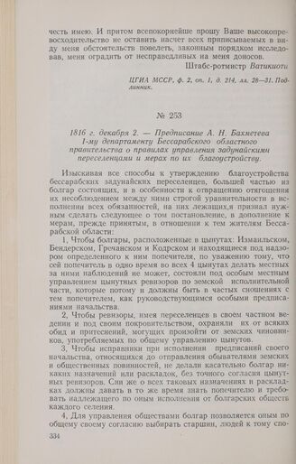 1816 г. декабря 2. — Предписание А. Н. Бахметева 1-му департаменту Бессарабского областного правительства о правилах управления задунайскими переселенцами и мерах по их благоустройству // ЦГИА МССР, ф. 2, оп. 1, д. 214, лл. 34—35. Отпуск.
