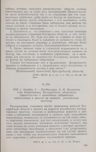 1816 г. декабря 2. — Предписание А. Н. Бахметева 1-му департаменту Бессарабского областного правительства о приведении задунайских переселенцев к присяге на верность российскому престолу // ООГА, ф. 1, оп. 214, д. 14, л. 32. Отпуск.