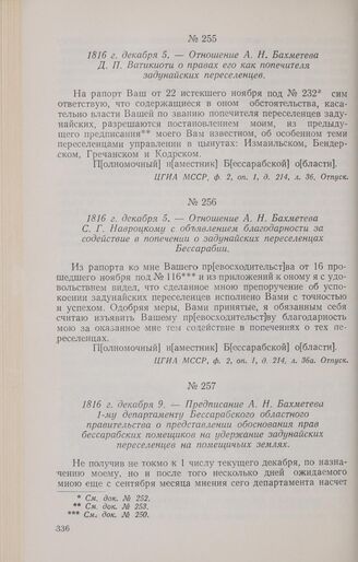 1816 г. декабря 9. — Предписание А. Н. Бахметева 1-му департаменту Бессарабского областного правительства о представлении обоснования прав бессарабских помещиков на удержание задунайских переселенцев на помещичьих землях // ЦГИА МССР, ф. 2, оп. 1, д. 214, лл. 38—39. Отпуск.
