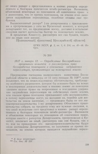 1817 г. января 12. — Определение Бессарабского временного комитета о рассмотрении прав бессарабских помещиков в отношении задунайских переселенцев, проживающих на помещичьих землях // ЦГИА МССР, ф. 4, оп. 1, д. 8, лл. 12—13. Подлинник.
