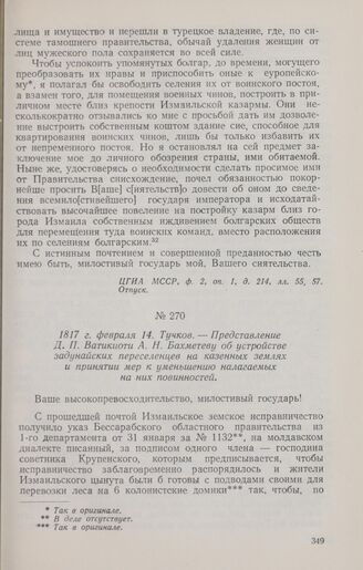 1817 г. февраля 14. Тучков. — Представление Д. П. Ватикиоти А. Н. Бахметеву об устройстве задунайских переселенцев на казенных землях и принятии мер к уменьшению налагаемых на них повинностей // ЦГИА МССР, ф. 2, оп. 1, д. 214, лл. 69—72. Подлинник.
