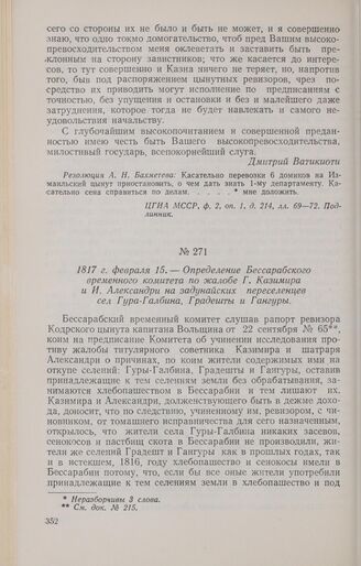 1817 г. февраля 15. — Определение Бессарабского временного комитета по жалобе Г. Казимира и И. Александри на задунайских переселенцев сел Гура-Галбина, Градешты и Гангуры // ЦГИА МССР, ф. 4, оп. 1, д. 9, лл. 23—24. Подлинник.