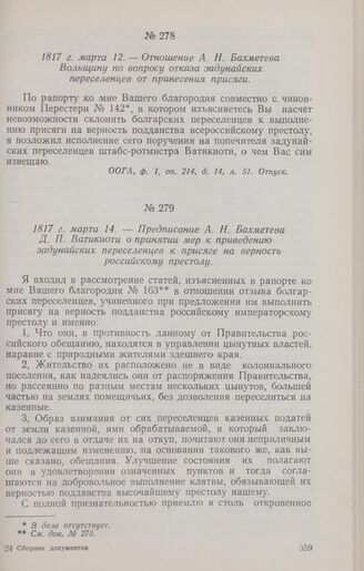 1817 г. марта 14. — Предписание А. Н. Бахметева Д. П. Ватикиоти о принятии мер к приведению задунайских переселенцев к присяге на верность российскому престолу // ЦГИА МССР, ф. 2, оп. 1, д. 214, лл. 82—87. Отпуск.