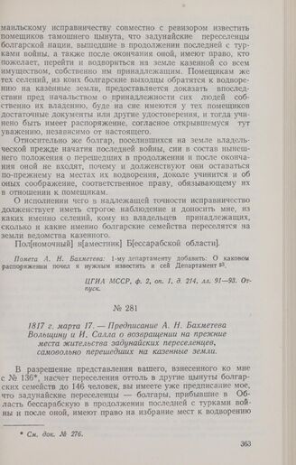 1817 г. марта 17. — Предписание А. Н. Бахметева Вольщину и И. Салла о возвращении на прежние места жительства задунайских переселенцев, самовольно перешедших на казенные земли // ЦГИА МССР, ф. 2, оп. 1, д. 214, л. 97. Отпуск.