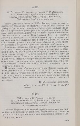 1817 г. марта 25. Копчак. — Рапорт Д. П. Ватикиоти А. Н. Бахметеву о предстоящем приведении к присяге задунайских переселенцев Гречанского, Кодрского и Бендерского цынутов // ООГА, ф. 1, оп. 214, д. 14, лл. 55—56. Подлинник.