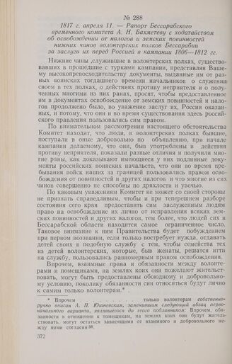 1817 г. апреля 11. — Рапорт Бессарабского временного комитета А. Н. Бахметеву с ходатайством об освобождении от налогов и земских повинностей нижних чинов волонтерских полков Бессарабии за заслуги их перед Россией в кампании 1806—1812 гг. // ЦГИА МССР, ф. 4, оп. 1, д. 92, лл. 1—2. Отпуск.