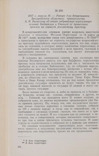 1817 г. апреля 16. — Рапорт 1-го департамента Бессарабского областного правительства А. Н. Бахметеву об отказе задунайских переселенцев селений Баймаклия и Еникиой от принесения присяги на верность российскому престолу // ООГА, ф. 1, оп. 214, д. 14, лл. 68—71. Подлинник.