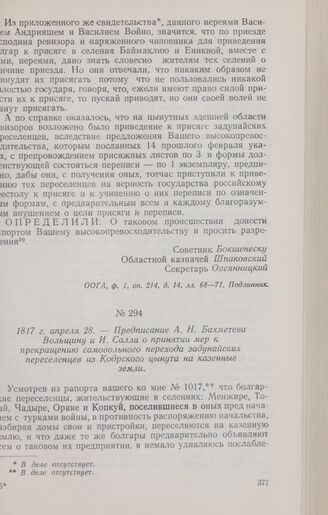 1817 г. апреля 28. — Предписание А. Н. Бахметева Вольщину и И. Салла о принятии мер к прекращению самовольного перехода задунайских переселенцев из Кодрского цынута на казенные земли // ЦГИА МССР, ф. 2, оп. 1, д. 214, лл. 110—111. Отпуск.