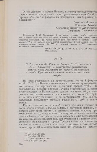 1817 г. апреля 30. Рени. — Рапорт Д. П. Ватикиоти А. Н. Бахметеву о ходатайстве задунайских переселенцев разрешить им переход из крепости и города Тучкова на казенные земли Измаильского цынута // ЦГИА МССР, ф. 2, оп. 1, д. 214, л. 123. Подлинник.