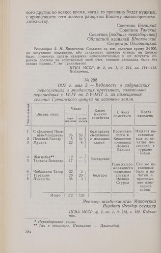 1817 г. мая 2. — Ведомость о задунайских переселенцах и молдавских крестьянах, самовольно перешедших с 14-ІV по 2-V-1817 г. из помещичьих селений Гречанского цынута на казенные земли // ЦГИА МССР, ф. 2, оп. 1, д. 214, л. 122. Подлинник.