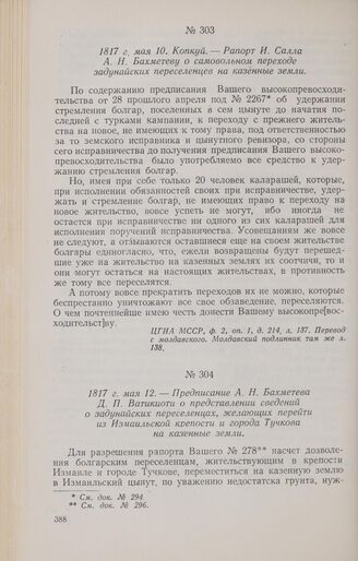 1817 г. мая 12. — Предписание А. Н. Бахметева Д. П. Ватикиоти о представлении сведений о задунайских переселенцах, желающих перейти из Измаильской крепости и города Тучкова на казенные земли // ЦГИА МССР, ф. 2, оп. 1, д. 214, лл. 124—125. Отпуск.