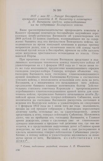 1817 г. мая 22. — Рапорт Бессарабского временного комитета А. Н. Бахметеву о возмещении Д. П. Ватикиоти средств, израсходованных им на содержание Болгарского войска // ЦГИА МССР, ф. 4, оп. 1, д. 95, лл. 1—3. Отпуск.