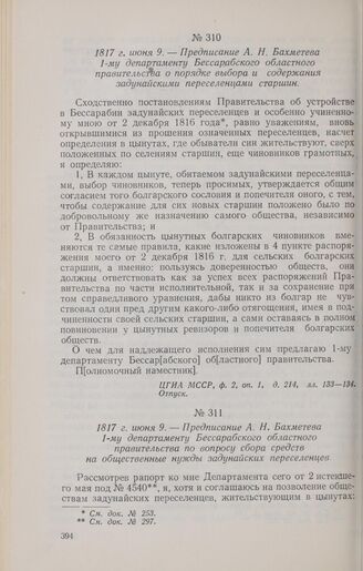 1817 г. июня 9. — Предписание А. Н. Бахметева 1-му департаменту Бессарабского областного правительства по вопросу сбора средств на общественные нужды задунайских переселенцев // ЦГИА МССР, ф. 2, оп. 1, д. 214, лл. 153—154. Отпуск.