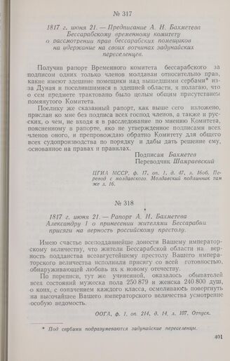 1817 г. июня 21. — Предписание А. Н. Бахметева Бессарабскому временному комитету о рассмотрении прав бессарабских помещиков на удержание на своих вотчинах задунайских переселенцев // ЦГИА МССР, ф. 17, оп. 1, д. 47, л. 16об. Перевод с молдавского. Молдавский подлинник там же л. 16.