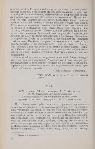 1817 г. июня 23. — Отношение А. Н. Бахметева Д. П. Ватикиоти о привлечении его к ответственности за поощрение самовольного перехода крестьян с помещичьих на казенные земли // ЦГИА МССР, ф. 2, оп. 1, д. 214, л. 164. Отпуск.