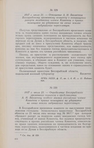 1817 г. июля 23. — Определение Бессарабского временного комитета о представлении А. Н. Бахметеву особого мнения российских членов Комитета о правах помещиков на удержание на своих землях задунайских переселенцев