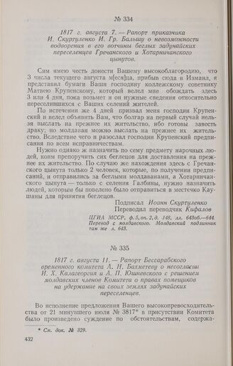 1817 г. августа 7. — Рапорт приказчика И. Скуртуленко И. Гр. Бальшу о невозможности водворения в его вотчины беглых задунайских переселенцев Гречанского и Хотарничанского цынутов // ЦГИА МССР, ф. 5, оп. 2, д. 148. лл. 643об.—644 Перевод с молдавского. Молдавский подлинник там же л. 643.