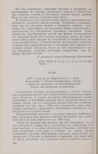 1817 г. августа 25. Царское Село. — Указ Александра I Правительствующему сенату о правилах заселения частновладельческих земель иностранными колонистами // ЦГИАЛ, ф. 1263, оп. 47, д. 126, лл. 233—234. Копия. Опубликован ПСЗРК, т. XXXIV, стр. 501—502.