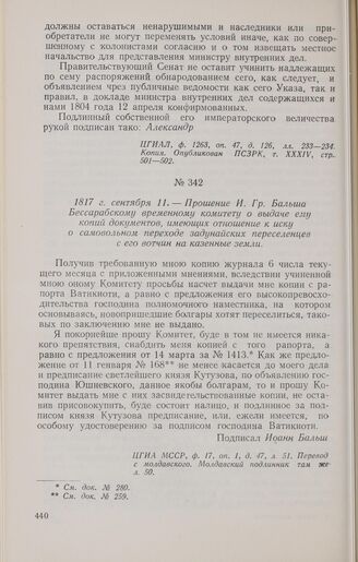 1817 г. сентября 11. — Прошение И. Гр. Бальша Бессарабскому временному комитету о выдаче ему копий документов, имеющих отношение к иску о самовольном переходе задунайских переселенцев с его вотчин на казенные земли // ЦГИА МССР, ф. 17, оп. 1, д. 47, л. 51. Перевод с молдавского. Молдавский подлинник там же л. 50.