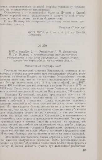 1817 г. октября 2. — Отношение А. Н. Бахметева И. Гр. Бальшу о невозможности насильственного возвращения в его села задунайских переселенцев, самовольно перешедших на казенные земли // ЦГИА MCCPt ф. 2, оп. 1, д. 214, л. 225. Отпуск.