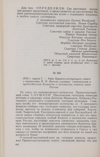 Главная История Молдавии: Док. и материалы. Т. II. Устройство задунайских п... Документы 1818 г. марта 7. — Указ Правительствующего сената о назначении И. Н...