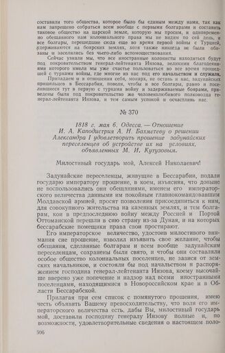 1818 г. мая 6. Одесса. — Отношение И. А. Каподистрия А. Н. Бахметеву о решении Александра I удовлетворить прошение задунайских переселенцев об устройстве их на условиях, объявленных М. И. Кутузовым