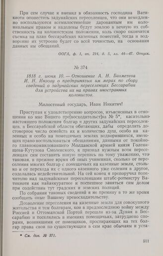 1818 г. июня 10. — Отношение А. Н. Бахметева И. Н. Инзову о предпринятых им мерах по сбору сведений о задунайских переселенцах Бессарабии для устройства их на правах иностранных колонистов // ООГА, ф. 1, оп. 214, д. 5, лл. 48—56. Отпуск.