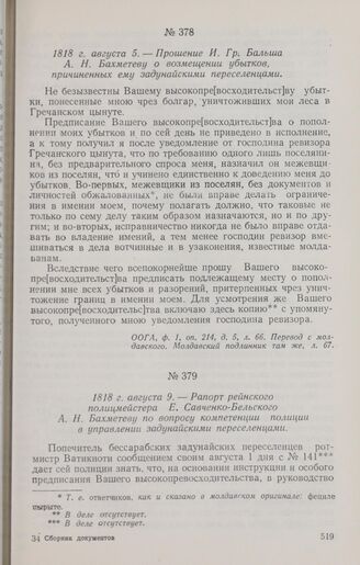 1818 г. августа 9. — Рапорт рейнского полицмейстера Е. Савченко-Бельского А. Н. Бахметеву по вопросу компетенции полиции в управлении задунайскими переселенцами // ООГА, ф. 1, оп. 214, д. 5, л. 70. Подлинник.