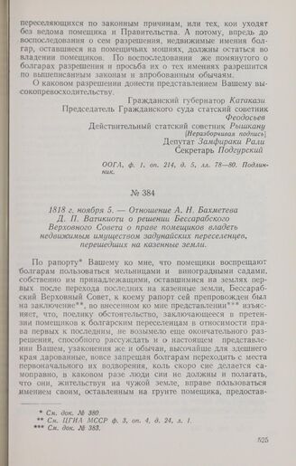1818 г. ноября 5. — Отношение А. Н. Бахметева Д. П. Ватикиоти о решении Бессарабского Верховного Совета о праве помещиков владеть недвижимым имуществом задунайских переселенцев, перешедших на казенные земли // ООГА, ф. 1, оп. 214, д. 5, лл. 81—82. Отпуск.