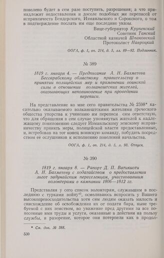 1819 г. января 8. — Рапорт Д. П. Ватикиоти А. Н. Бахметеву с ходатайством о предоставлении льгот задунайским переселенцам, участвовавшим волонтерами в кампании 1806—1812 гг. // ООГА, ф. 1, оп. 214, д. 5, лл. 94, 97. Подлинник.
