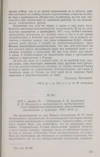 1819 г. января 18. — Отношение А. Н. Бахметева Д. П. Ватикиоти о невозможности предоставления льгот задунайским переселенцам, участвовавшим волонтерами в кампании 1806—1812 гг. // ООГА, ф. 1, оп. 214, д. 5, л. 98. Отпуск.