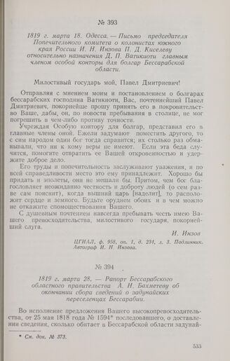 1819 г. марта 28. — Рапорт Бессарабского областного правительства А. Н. Бахметеву об окончании сбора сведений о задунайских переселенцах Бессарабии // ООГА, ф. 1, оп. 214, д. 5, лл. 108—109. Подлинник.